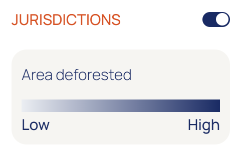 A Jurisdictional deforestation layer is available since the EUDR cutoff date. The layer is intended to give you an indication on sourcing risk and need for intervention for particular sourcing regions. Jurisdictions are classified in low to high deforestation risk based on the prevalence of deforestation in relation to the size of the jurisdiction.