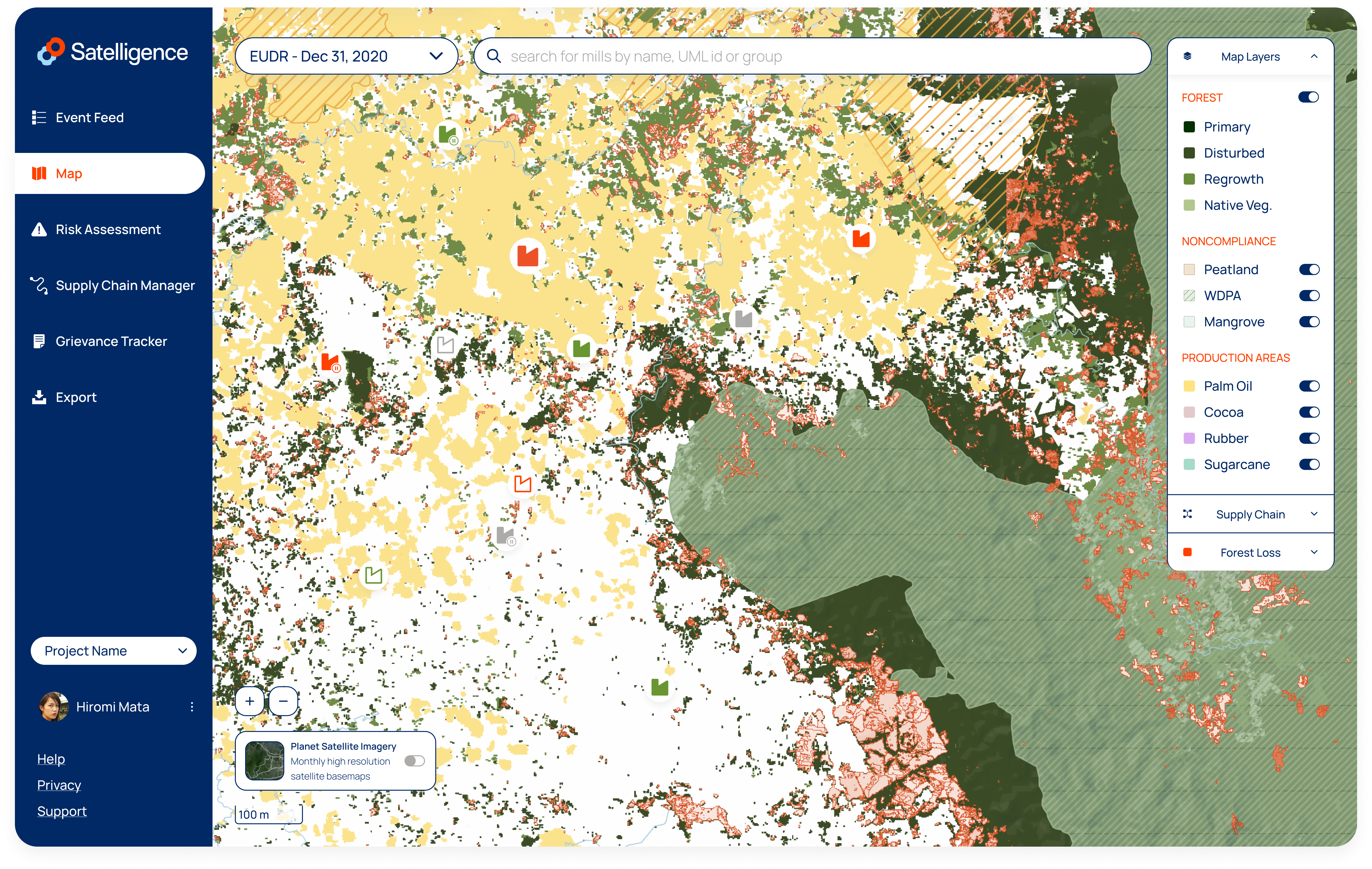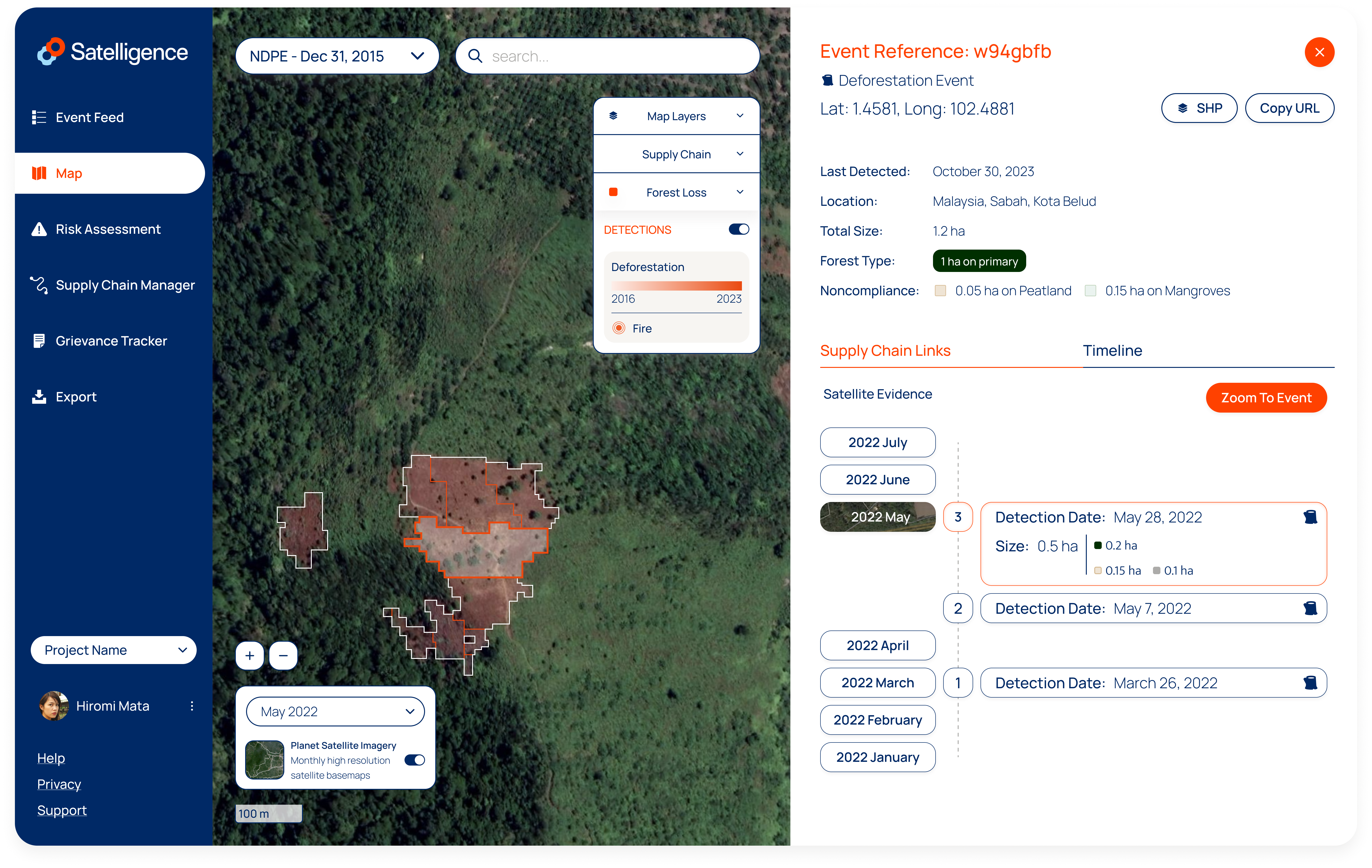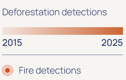 An always up to date, interactive map of the world displaying deforestation, forest, noncompliance boundaries, production areas and spatial supply chain entities. Same as on the Event Feed you will find deforestation events for forest loss and fire events for which we have not (yet) detected forest loss.