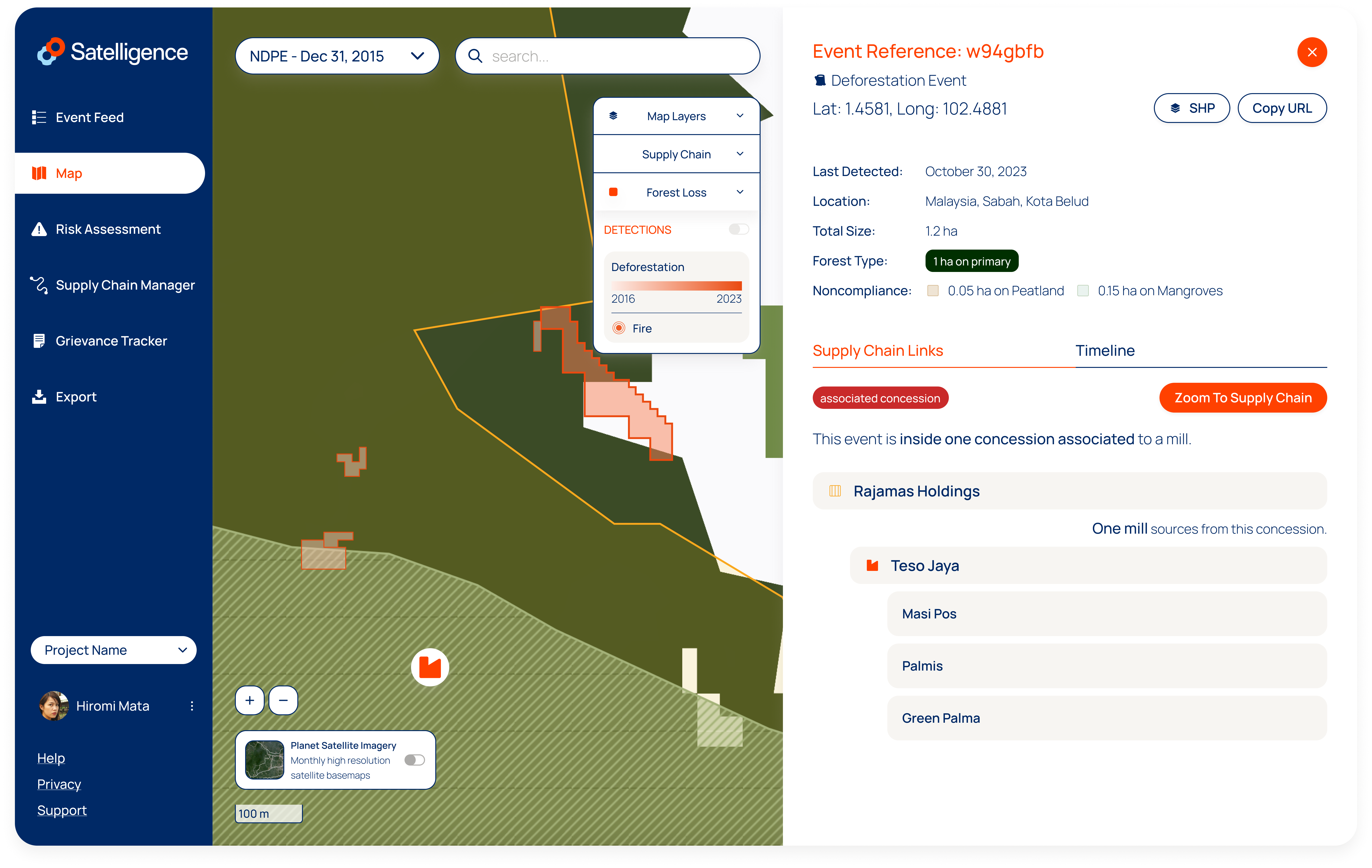 To investigate how an event relates to your supply chain, click on the Supply Chain Links tab. If the data is available in the Satelligence database, it will show you the name of the concession, and name(s) of the relevant mills in the area. On the map, you can also click on the mill icon to access more information about the mill. On the right hand side, more information will be displayed regarding the supply link.