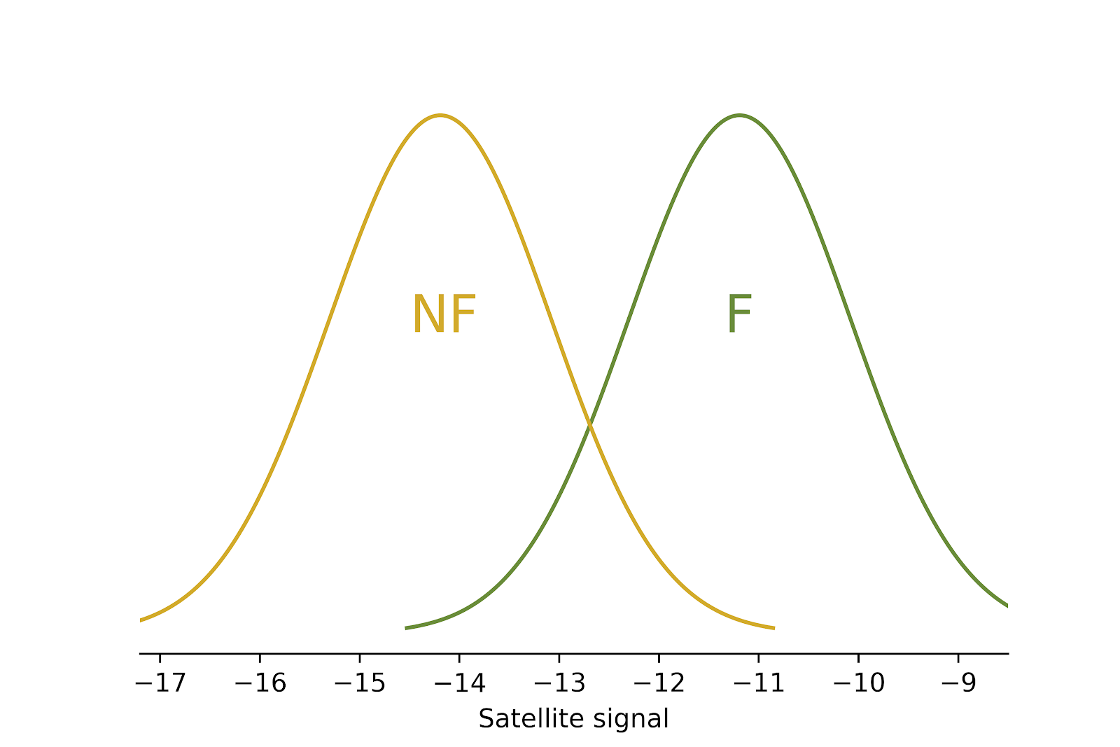Now we know what the distributions of the signal from the satellite look like for forest and non-forest. When a new satellite image comes in, we calculate the probability that the new measurement fits within the Forest class and the Non-Forest class, and consequently, the probability that an area has changed.