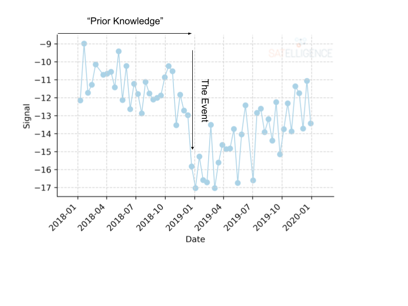 Figure 1. Radar Satellite signal through time. Showing the ‘prior knowledge’ (when the area was forest) and ‘the event’ (deforestation) parts which are used in Bayesian statistics