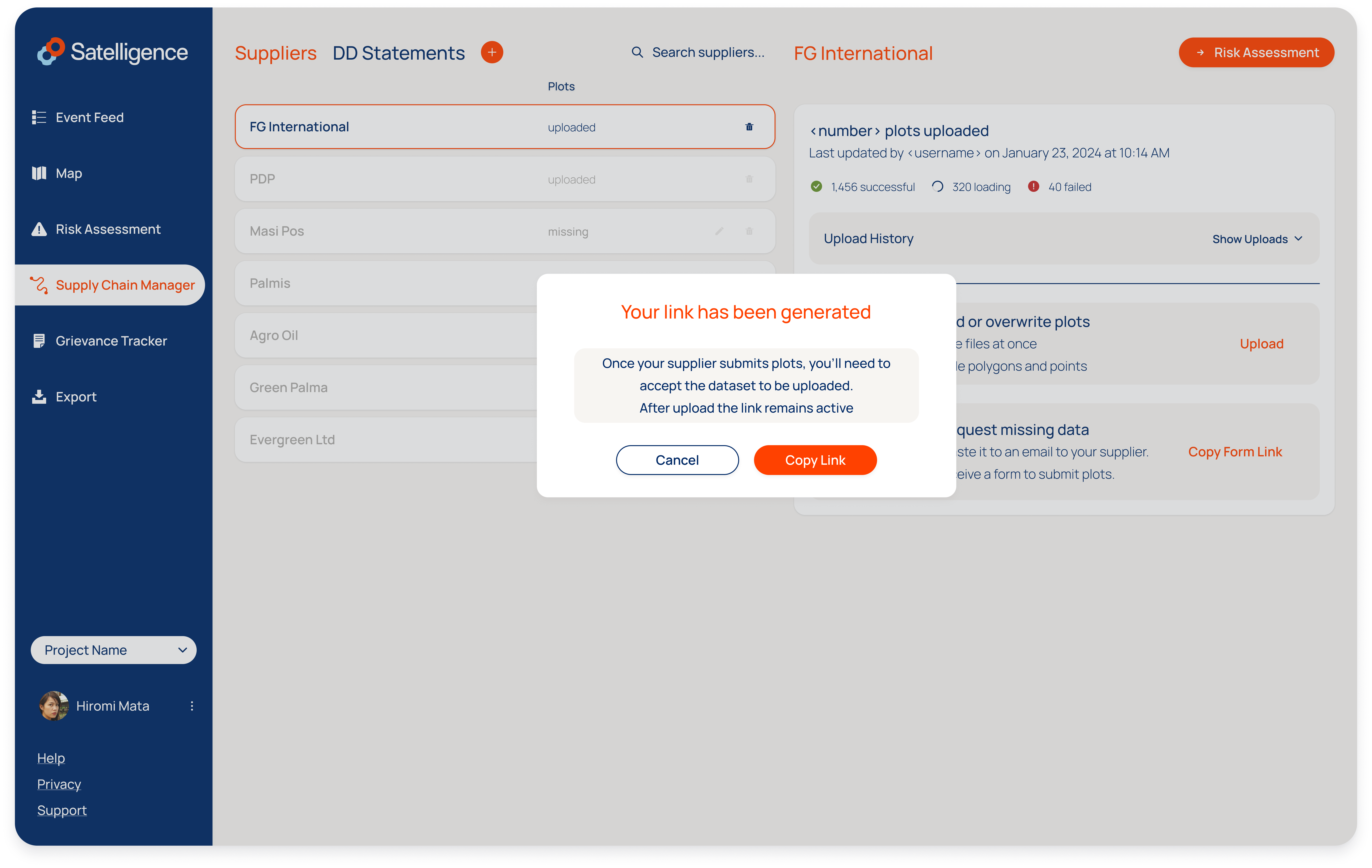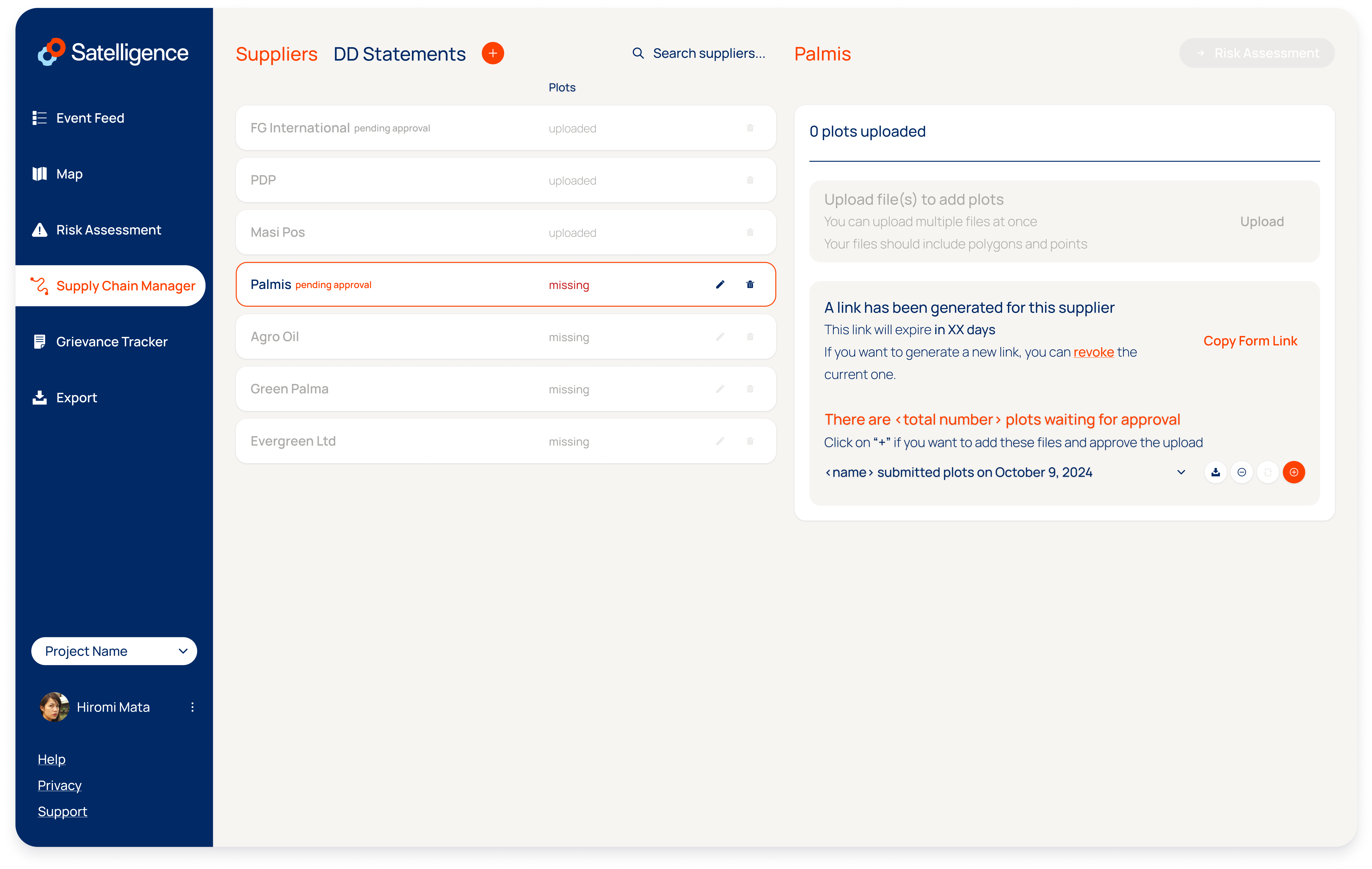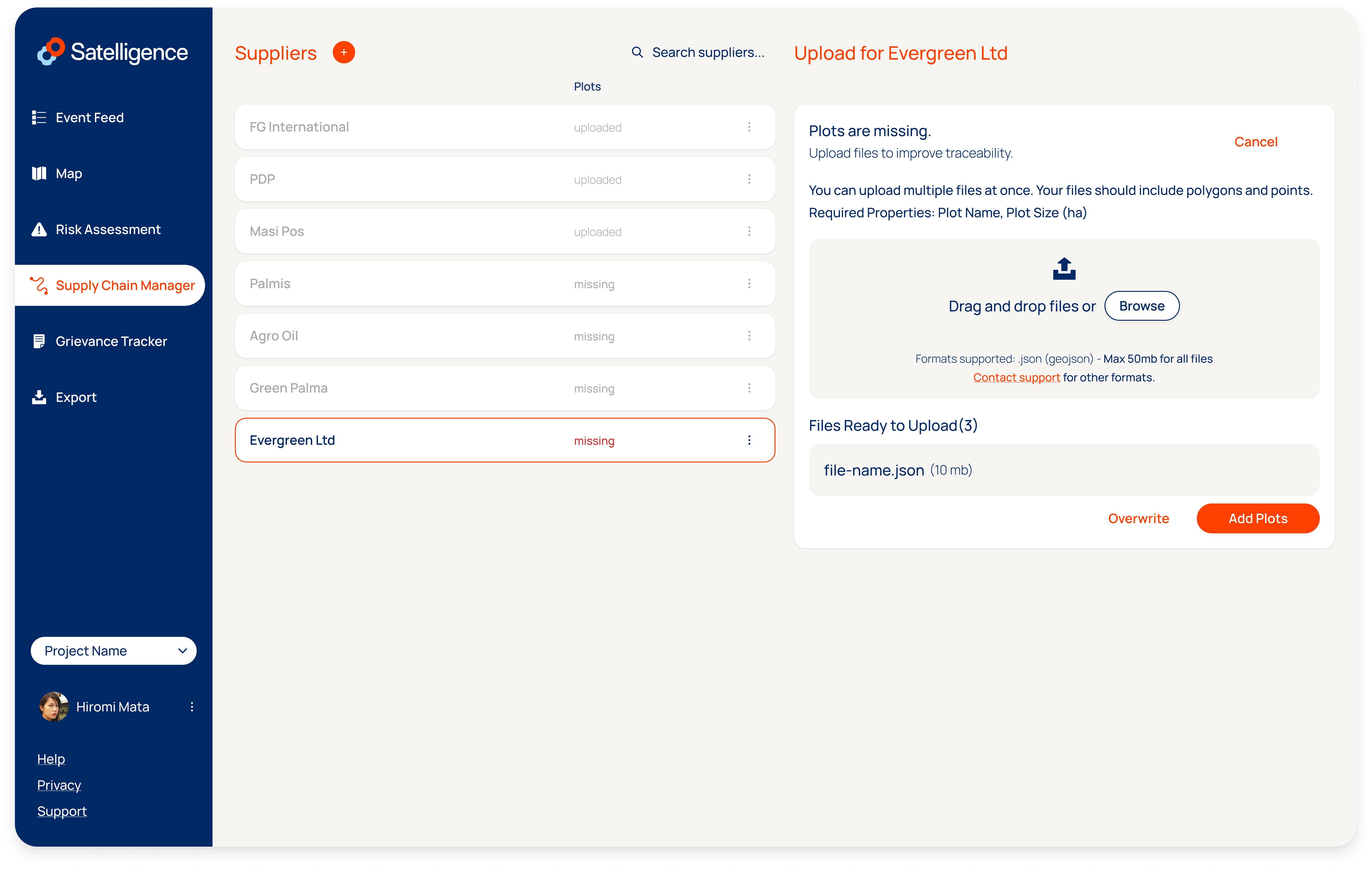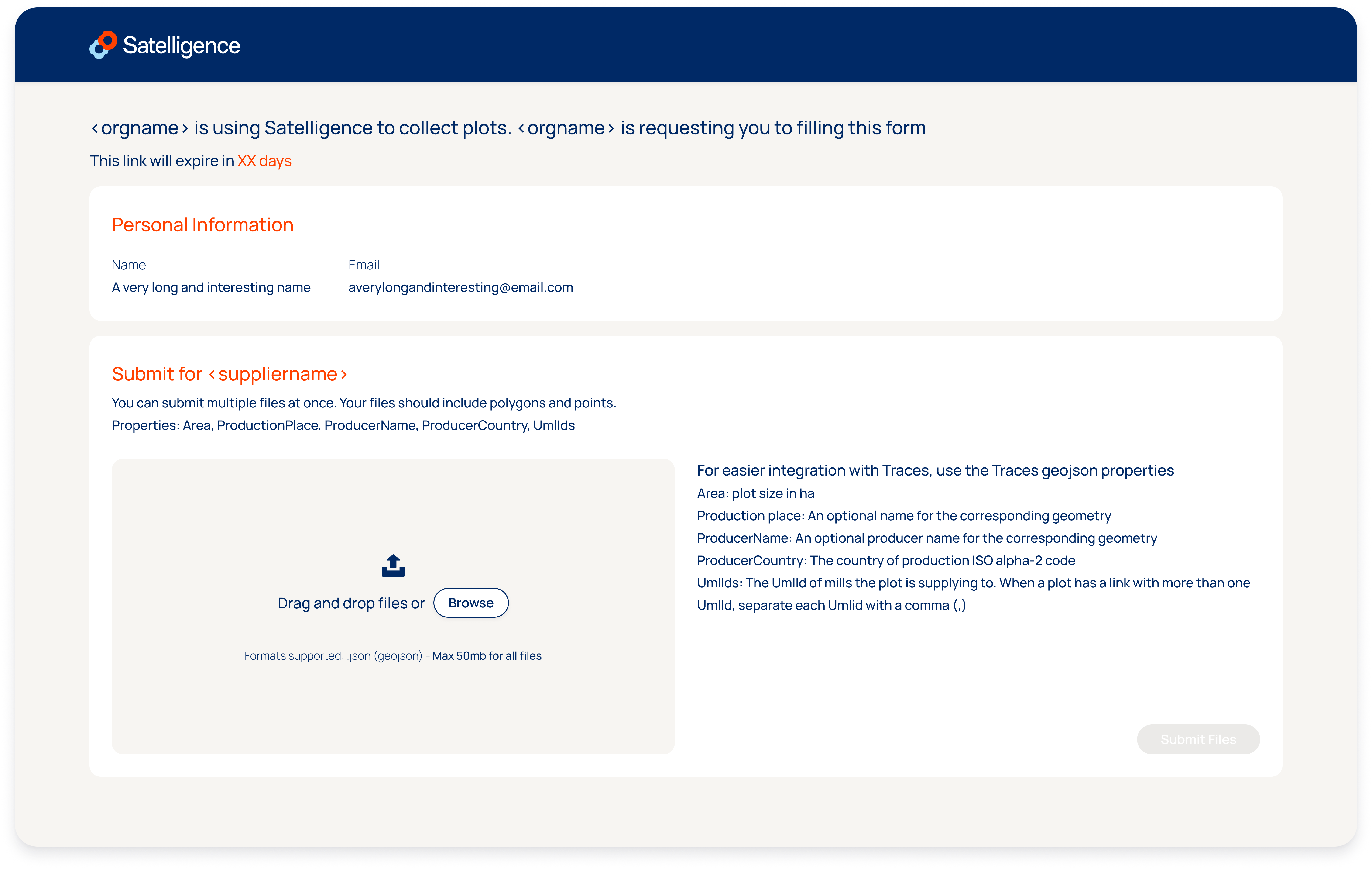 After the request is shared, suppliers can follow the link to arrive at a page with the standard plot upload interface used in the platform. When suppliers have questions about the file upload, the documentation on the satelligence resource center can be shared with them.