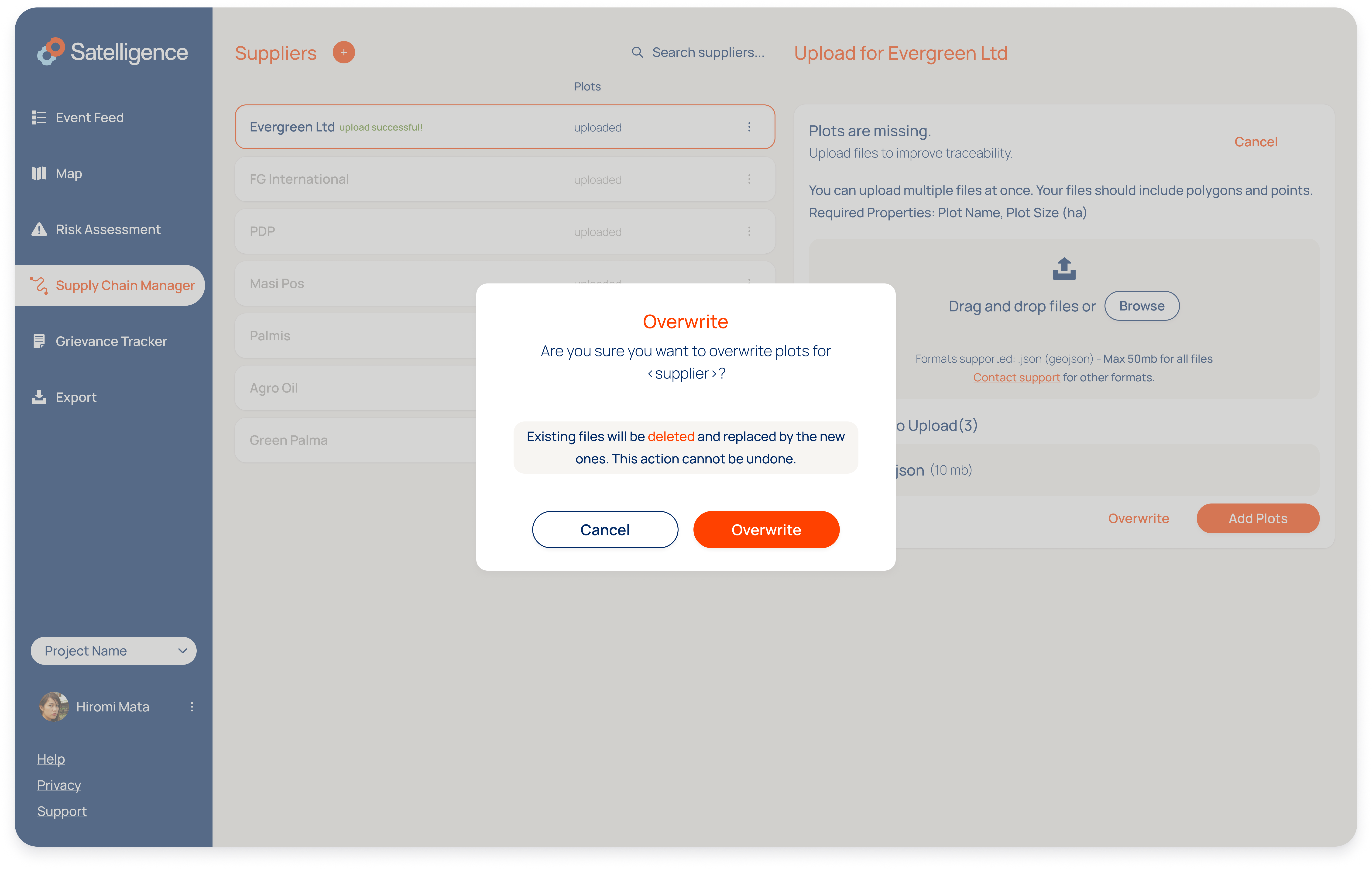 After plots have been uploaded by a supplier the file has passed the quality checks that are embedded in the platform. The file will be available for download to allow a review of the data. To finish the process the plots need to be accepted to overwrite or be added to the existing supply chain dataset.