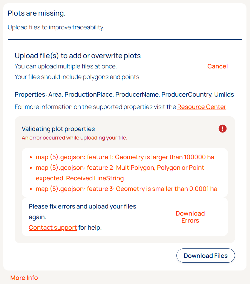 Select files from your file browser and drag those into the drop zone or click Browse to open a file picker. You can add multiple files (with the extension .json or .geojson) and the files can contain a mix of different geometry types. When you have all the files lined up, proceed by clicking Add Plots. You will first see a message Validating plot properties, followed by Updating your supply chain. You can leave this page and await updates to the platform. It takes up to one business day to see the changes.