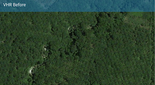 VHR imagery of an area on Sumatra, Indonesia. Showing a tree cover clearing of approximately 0.15 ha. The Satelligence algorithm very clearly detects this tree cover loss.